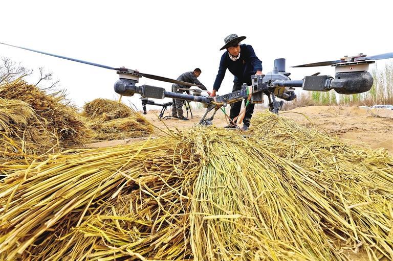 2025年5月,张掖市高台县西沙窝“三北”工程项目现场工人操控无人机吊运稻草。